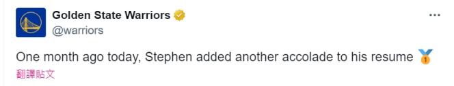 勇士官推今天再次发推纪念道:“一个月前的今天,库里给履历里增加了又一项荣誉!”